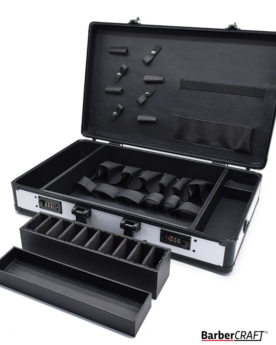 Të ndërtuara me materiale të qëndrueshme, me ndarje të dedikuara për çdo vegël pune si makina, gërshërë, tharëse, furça dhe produkte stilimi tashmë këto valixhe janë zgjidhja ideale për berberët në lëvizje, të cilët punojnë në shtëpi apo evente!